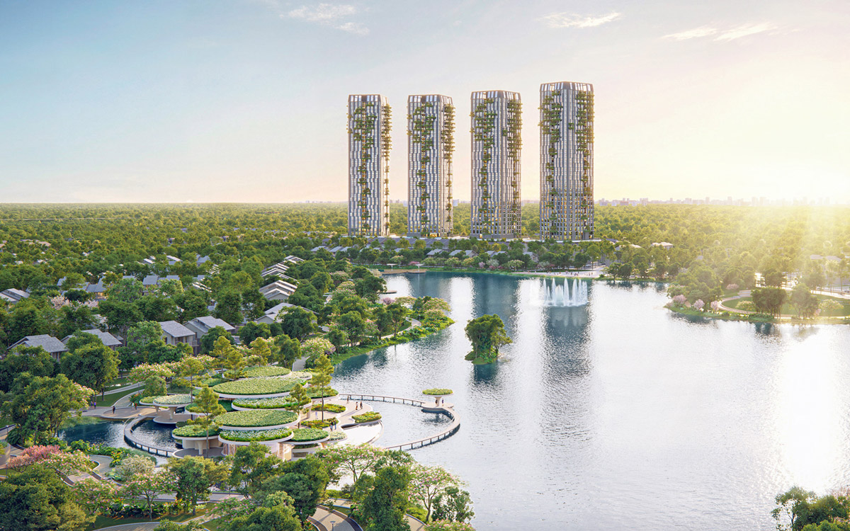 Cụm 04 tháp căn hộ được thiết kế với chiều cao lên tới 41 tầng, tạo nên dấu ấn kiến trúc nổi bật trong tổng thể Eco Retreat. Ngôn ngữ thiết kế theo xu hướng khoáng đạt, mở và đa lớp, ưu tiên các không gian đón gió, ánh sáng tự nhiên và tầm nhìn rộng mở về phía hồ nước, công viên và các trục cảnh quan chính.