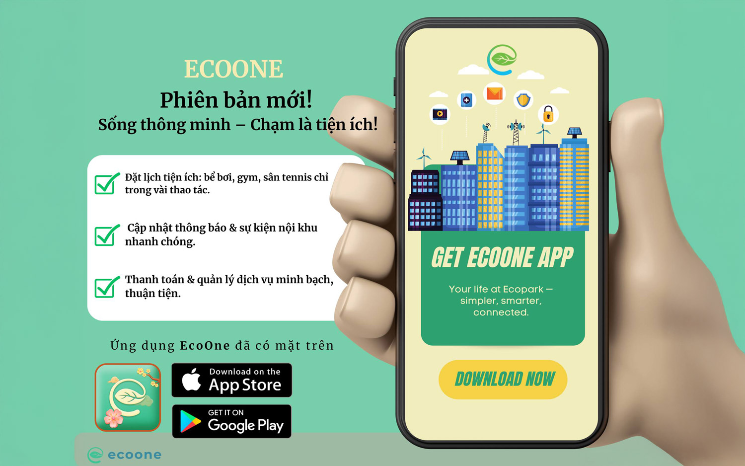 Từ nay, mọi thông tin quan trọng như thông báo nội khu, sự kiện cộng đồng, phản ánh dịch vụ hay thanh toán điện nước đều được tích hợp trên một nền tảng duy nhất. Với EcoOne, cư dân có thể theo dõi, tương tác và kết nối với ban quản lý và cộng đồng Ecopark chỉ bằng một thao tác đơn giản.
